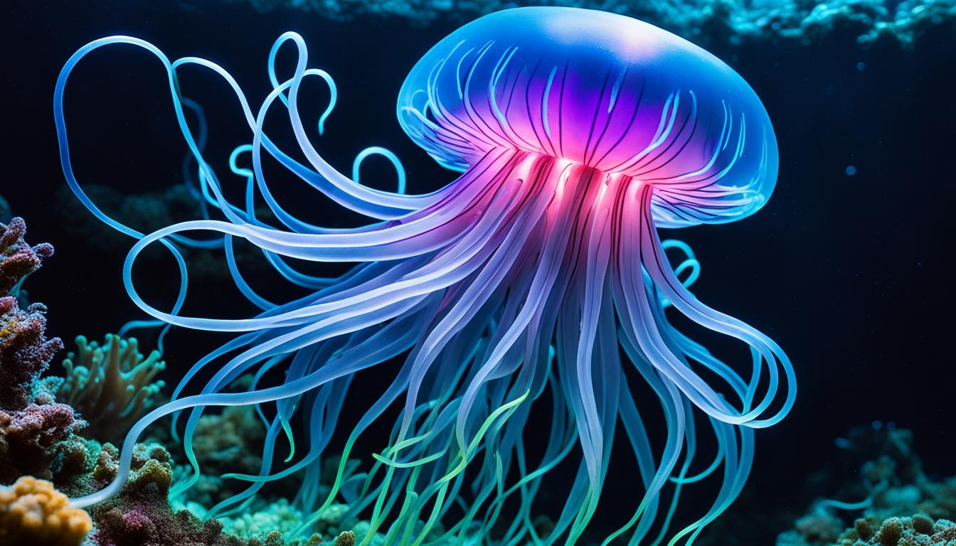 Deep in the ocean, a magical world shines with the glow of bioluminescent marine life. These creatures can make their own light, lighting up the dark sea. This creates a sight that takes our breath away.